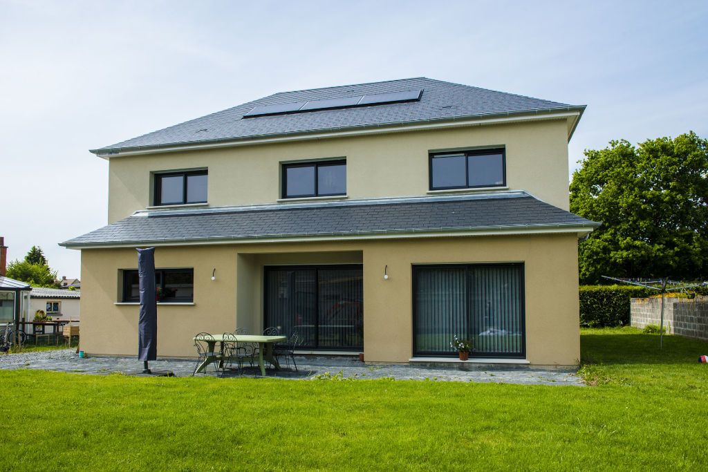 Maison contemporaine sur mesure, située au nord de Caen, toit 4 pans ainsi que 3 pans. Panneaux solaires et huisseries aluminium gris anthracite sur mesure. Finition de façade enduit couleur sable et gris clair.